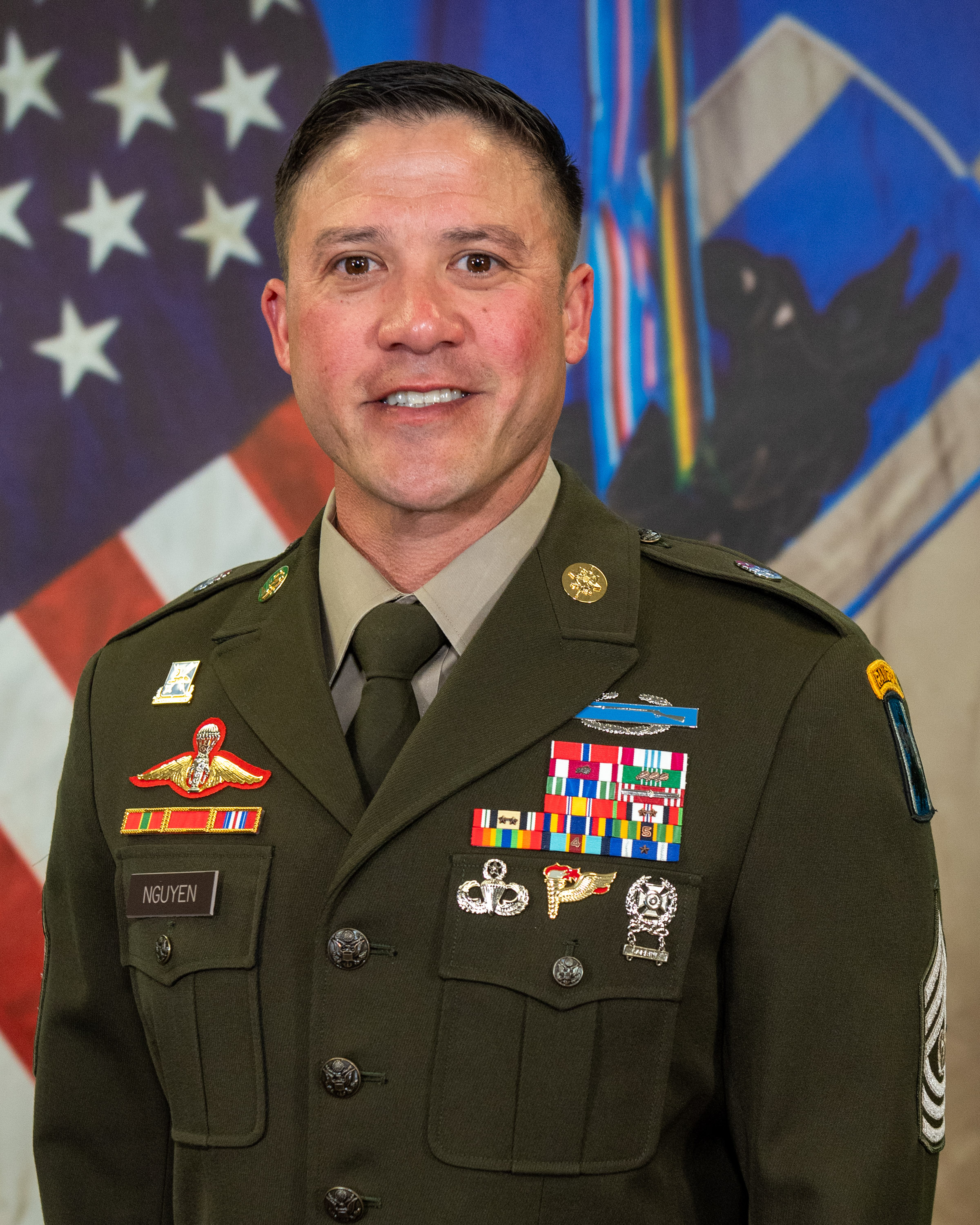 CSM Nam K. Nguyen enlisted in the United States Army out of Arlington, TX, as an Infantryman. He attended basic training, advanced individual training (AIT), and airborne school at Fort Benning, GA. His first assignment was with the 1-501st Parachute Infantry Regiment at Fort Richardson, AK. He served as a machine gunner and squad designated marksman on an Infantry Fire Team. Later, CSM Nguyen assessed and was selected into the Headquarters and Headquarters Company (HHC) Reconnaissance and Surveillance Platoon. He served as an assistant team leader and later advanced to team leader. CSM Nguyen then served as a Ranger Instructor (RI) at the 6th Ranger Training Battalion at Eglin Air Force Base, FL. After his time as an RI, he entered the Army's bonus, extension, and retraining program in 2012 to become a Cryptologic Linguist. He attended the Defense Language Institute (DLI) at the Presidio of Monterey, CA, followed by AIT at Goodfellow Air Force Base, TX.